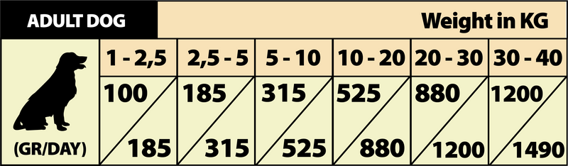 Die empfohlene Tagesmenge sollte 10 % der üblichen Kalorienzufuhr des Hundes nicht überschreiten. Kühl und trocken lagern und bei Raumtemperatur servieren. Nach dem Öffnen gekühlt aufbewahren und innerhalb von maximal 48 Stunden verbrauchen. Der Hund muss immer frisches Wasser zur Verfügung haben.