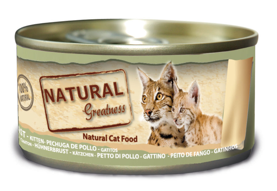Natural Greatness Hühnerbrust ist ein Ergänzungsfutter für Kätzchen, hergestellt aus den in der Zusammensetzung aufgeführten natürlichen Zutaten. Diese Dose mit Ultra-Premium-Katzenfutter enthält keine Zusatzstoffe, tierischen Nebenprodukte oder Füllstoffe.