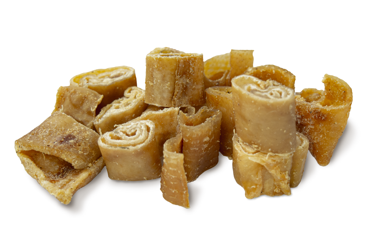 Köstliche Schweineschwarten, die bei niedriger Temperatur getrocknet wurden, um alle Nährstoffe und den natürlichen Geschmack zu erhalten. Dieser Snack aus einer einzigen Proteinquelle wird ausschließlich aus Schweinefleisch in Lebensmittelqualität hergestellt. Dieser hypoallergene und getreidefreie Snack ist reich an biologisch hochwertigen Proteinen, die für die Geweberegeneration und die Funktion des Immunsystems unerlässlich sind. Es handelt sich um einen lang anhaltenden, sättigenden und fettarmen Snack, ideal für Hunde, die ihr Gewicht kontrollieren müssen. Darüber hinaus fördert sein natürlicher Kollagengehalt die Gelenkgesundheit, und seine knusprige Textur hilft, Zahnbelag und Zahnstein zu reduzieren und trägt so zur Erhaltung gesunder Zähne und Zahnfleisch bei.