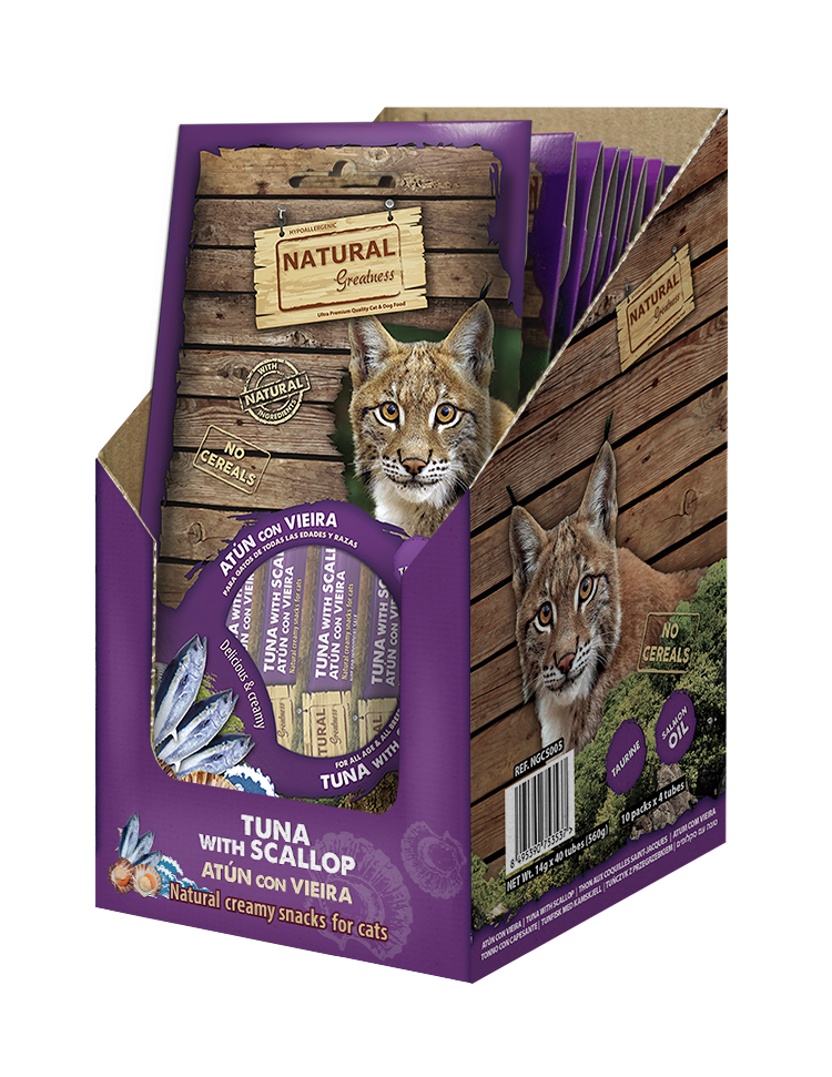 Natural Greatness Thunfisch und Jakobsmuschel Creme ist ein weicher, cremiger, getreidefreier Snack mit hochwertigem Thunfisch und Jakobsmuschel, angereichert mit Taurin, Omega-3- und Omega-6-Fettsäuren (aus Lachsöl) und DHA zur Förderung der Gehirnfunktion in allen Lebensphasen der Katze.
