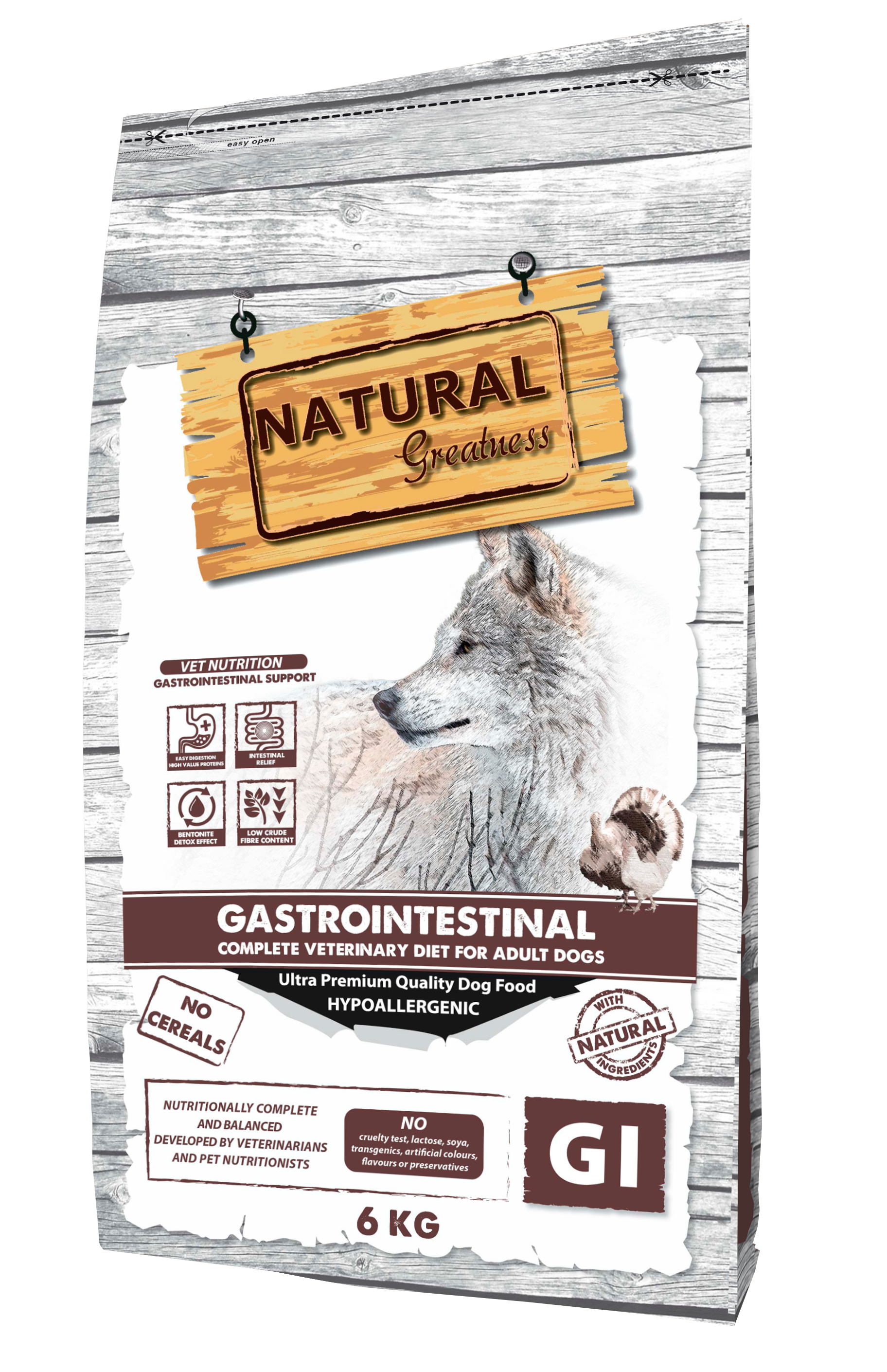 Natural Greatness Gastrointestinal ist ein komplettes, getreidefreies, hypoallergenes Rezeptfuttermittel für erwachsene Hunde aller Rassen mit Resorptionsstörungen des Darms. Es enthält FOS- und MOS-Präbiotika zur Verbesserung der Nährstoffaufnahme und ist dank seines höheren Natrium- und Kaliumgehalts sowie der Proteine tierischen Ursprungs mit hoher biologischer Wertigkeit sehr gut verdaulich.
