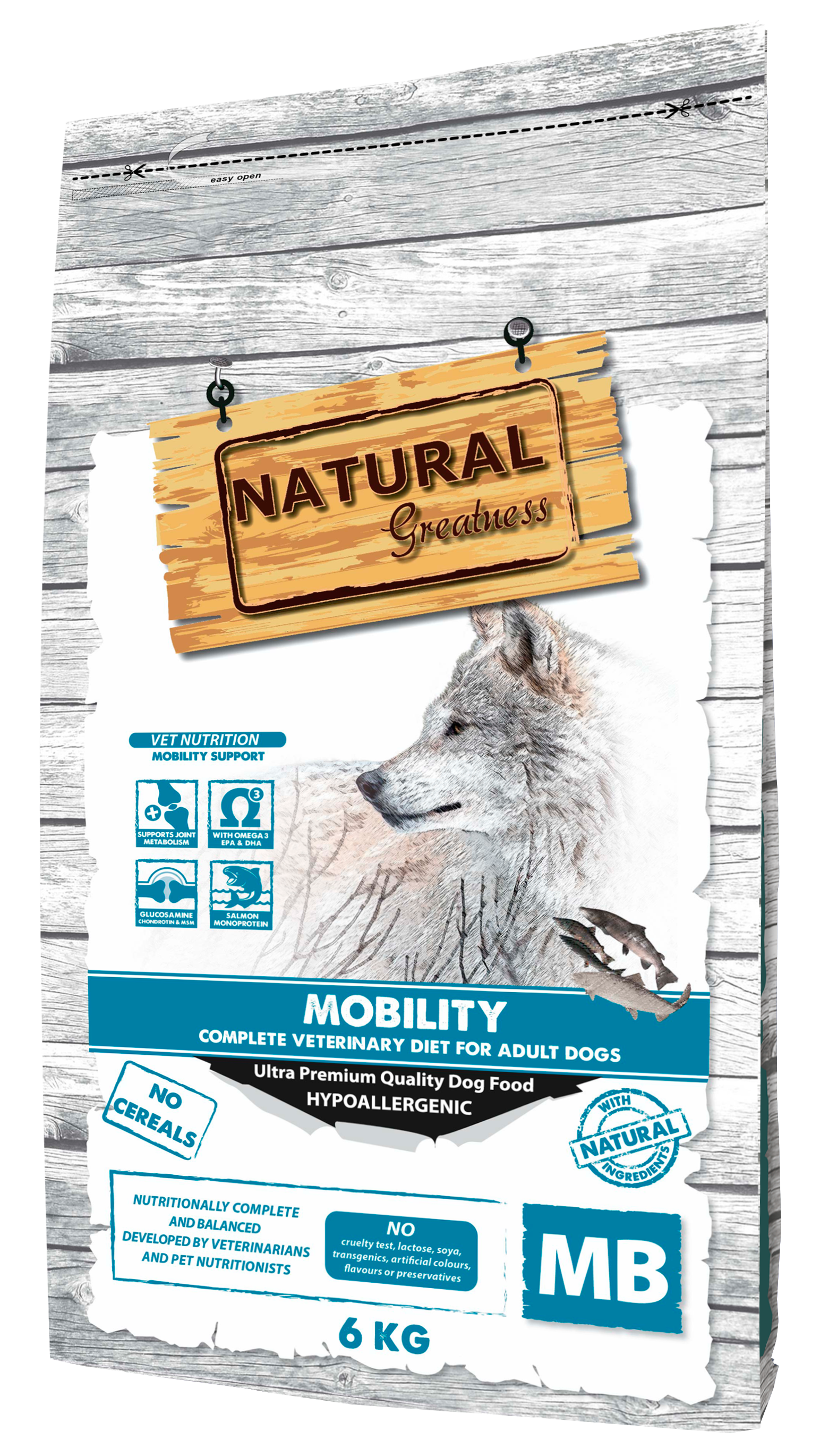 Natural Greatness Mobility ist ein getreidefreies, hypoallergenes Alleinfuttermittel für ausgewachsene Hunde aller Rassen, die eine unterstützende Ernährung bei Erkrankungen wie Arthrose benötigen. Dieses Futter wird mit Lachs als einziger tierischer Proteinquelle hergestellt. Es zeichnet sich durch seinen hohen Gehalt an Omega-3, EPA, DHA, Vitamin E, Glucosamin, Chondroitin und MSM aus. Der Zusatz von MSM ist von entscheidender Bedeutung, da es den Knorpelstoffwechsel fördert, den Knorpelabbau hemmt und zu dessen Regeneration beiträgt.
